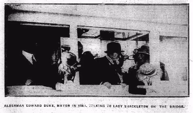Alderman Duke talking to Lady Shackleton – Eastbourne Gazette, 1 February 1922. (The picture had appeared with ‘The Quest at Eastbourne’ in 1921 with the caption ‘The Mayor talking to Lady Shackleton on the Bridge’.)